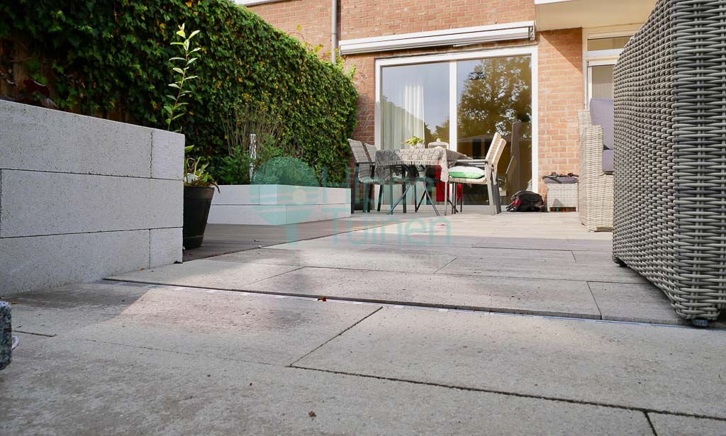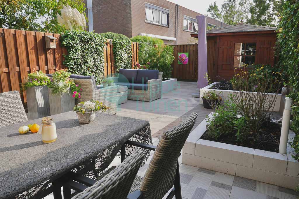 Allereerst is op het hoofdterras gebruik gemaakt van de GeoCeramica Canvas patchwork. Een keramische tegel van 60×60 cm met een uniek patroon als een vloerkleed. Perfect om dat binnen naar buiten gevoel te creëren. Daarnaast een vlonderterras van Fiberon composiet planken en als looppad Geotravertino Lazise 40×80 cm. De borders zijn verhoogd en gemaakt van patioblokken in de kleur wit. Kortom een zeer geslaagd tuinontwerp moderne onderhoudsarme stadstuin.